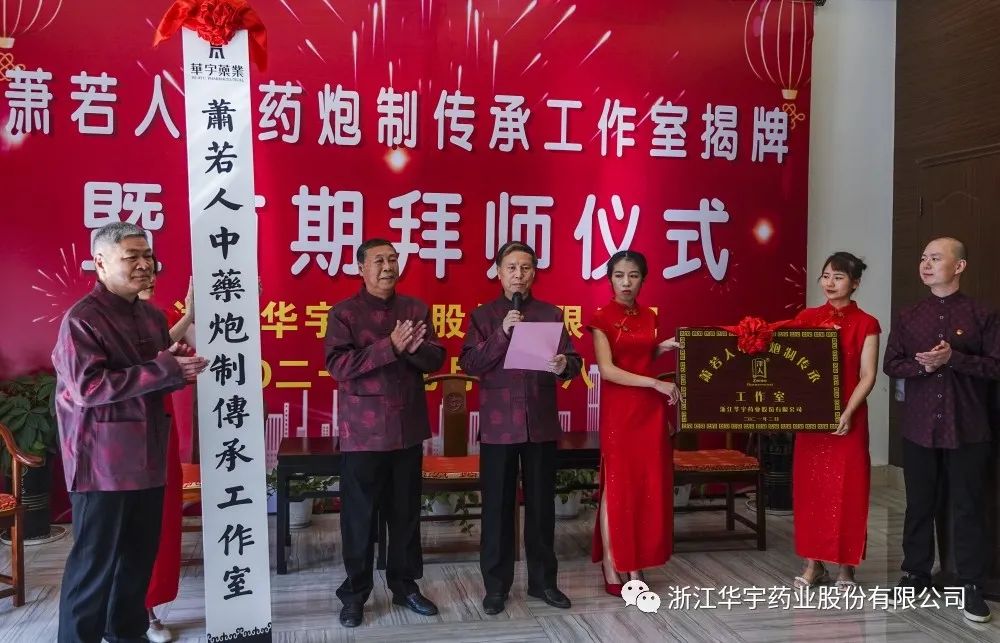 公司萧若人中药炮制传承工作室揭牌仪式和首期中药炮制传承拜师仪式。会议由工会主席黄建新主持。